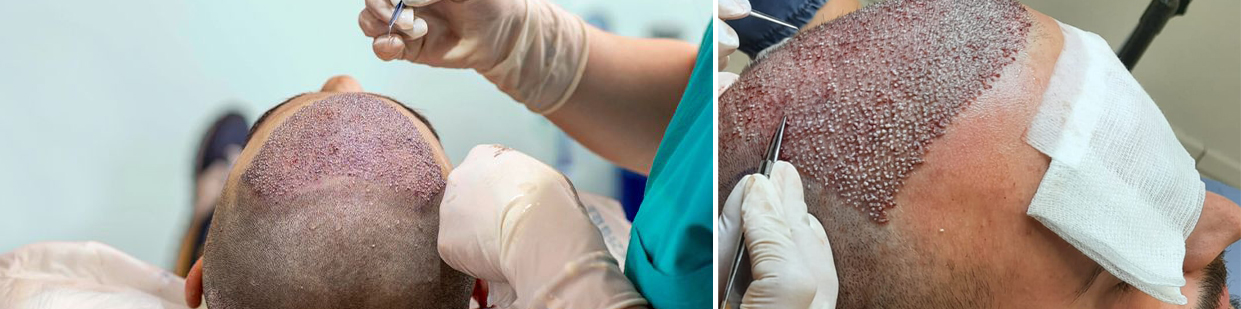 Patient comes to clinic after taking breakfast. Patient hairs are trimmed and he is prepared for OT. Area of scalp where hair is to implanted is anesthetized and slits are made. Subsequently hairs are extracted from donor area usually back and sides of scalp in a session of 500 to 1000hairs. These are then implanted into slits. Multiple such sessions are repeated till required number of grafts has been implanted. Patient dressing is done and patient is given post op instructions and provided with medicines. Patient can go home same day, 2-day session might be needed if grafts >3000.